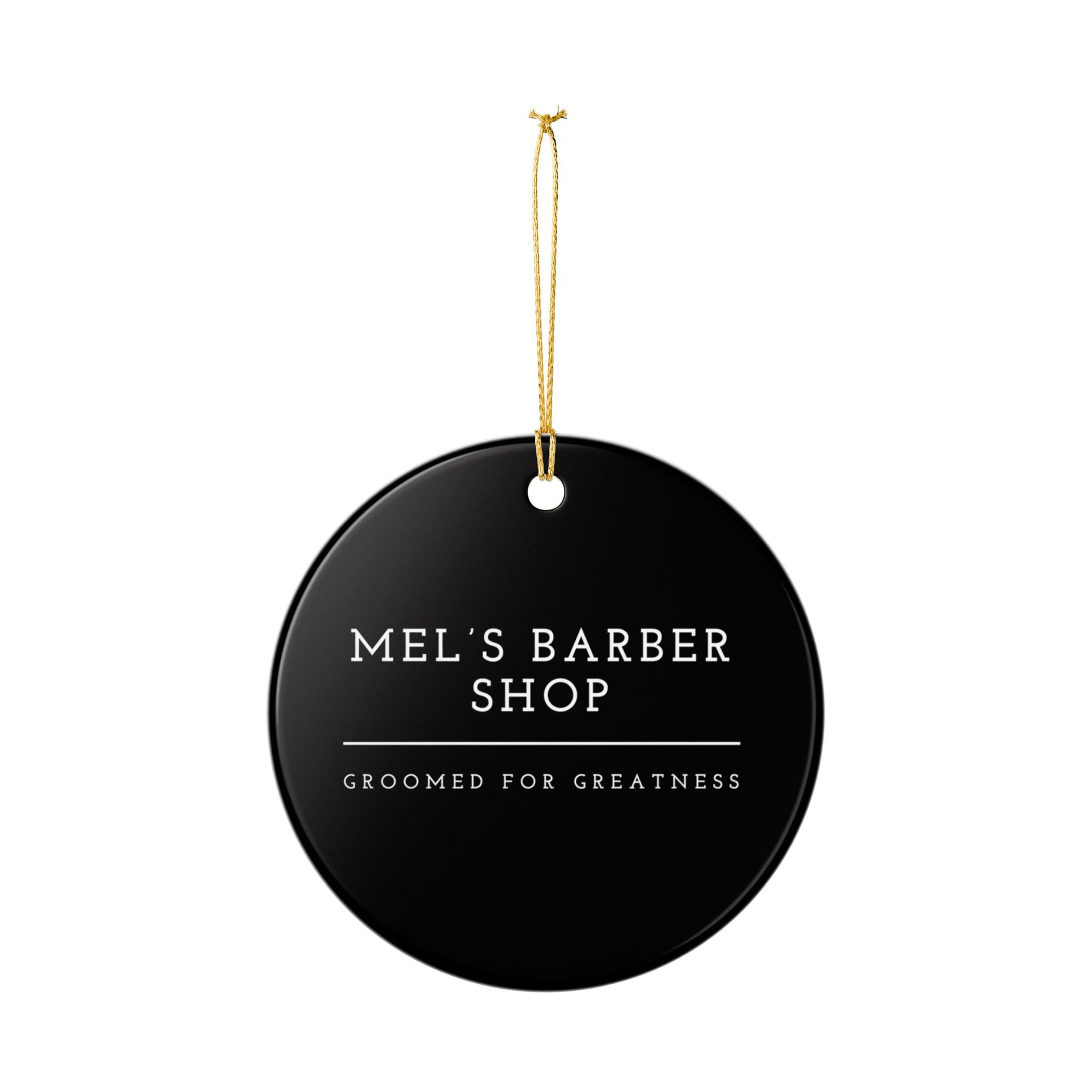 Barber Shop Ceramic Ornament — "Mel's Barber Shop: Groomed for Greatness"