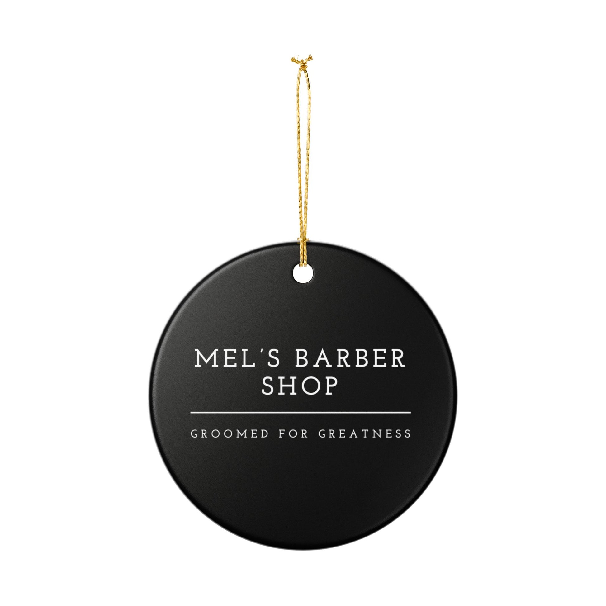 A crisp, ceramic round ornament finished in matte-printed black with white lettering and a slim gold hanging string. The design reads “Mel’s Barber Shop” with a thin divider line and the tagline “Groomed for Greatness,” giving a minimal, vintage-barbershop feel. Lightweight but solid, the glossy ceramic body contrasts the subtle matte print for a refined, tactile look. Hang it in a shop window, above the reception chair, or tuck it into a gift bag for a loyal client — it brings a quiet, professional charm to any small-space display.